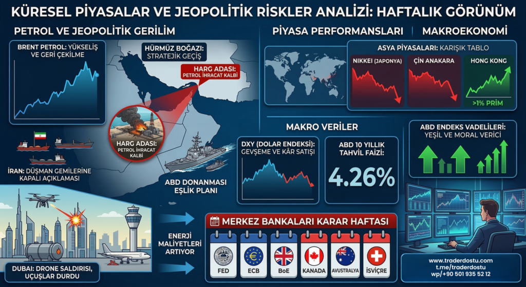 1. JEOPOLİTİK HAT: HARG ADASI, DUBAİ VE HÜRMÜZ BOĞAZI Asıl aksiyon Orta Doğu hattında dönüyor. ABD’nin İran’ın petrol ihracatındaki kalbi sayılan Harg Adası’nı vurmasıyla Brent petrol haftaya sert bir sıçramayla başladı, adeta “fişek” gibi girdi. Ancak sonrasında kâr realizasyonları ve kâr satışı ile bu kazanımların bir kısmı geri verildi. Piyasalar şu an, ABD donanmasının Hürmüz Boğazı’nda gemilere eşlik etme ihtimalini fiyatlıyor. İran’dan gelen “Hürmüz sadece düşman gemilerine kapalı” açıklaması piyasadaki stresi bir miktar yatıştırsa da, sıcak haber akışı devam ediyor. İran’ın bölgeye yönelik saldırıları sürüyor; Dubai havalimanında bir yakıt tankına drone vurması sonrası uçuşlar askıya alındı. Hürmüz küresel enerjinin şah damarı ve savaş başladığından beri enerji maliyetlerini yukarı çekiyor. Bu bölgedeki gelişmeleri anlık takip etmeli ve volatiliteye karşı hazırlıklı olmalısın.