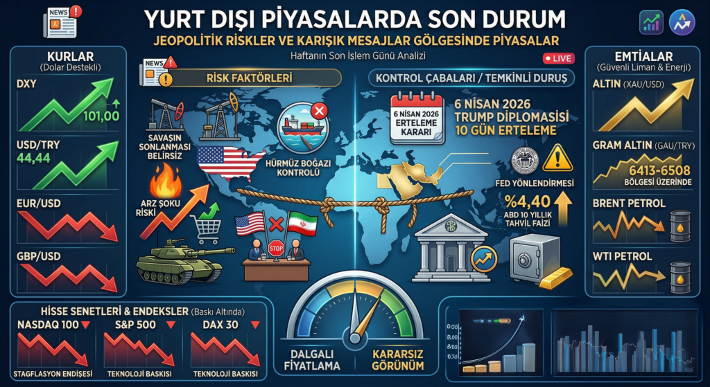 Genel Değerlendirme: Jeopolitik Belirsizlikler ve Karışık Fiyatlama Davranışları Küresel piyasalarda jeopolitik gelişmeler, varlık fiyatlamaları üzerinde ana belirleyici konumunu sürdürmektedir. ABD Başkanı Trump’ın, İran enerji altyapısına yönelik olası operasyonları 6 Nisan 2026 tarihine kadar ertelediğine dair açıklamaları tansiyonu kısa vadede sınırlamış görünse de, diplomatik çözüm arayışlarına dair taraflardan gelen çelişkili mesajlar kalıcı bir iyimserliğin oluşmasını engellemektedir. Piyasa katılımcıları, riskleri fiyatlamalarına dahil etmekle birlikte, henüz net bir yöne işaret eden bir konsensüs oluşturamamıştır.